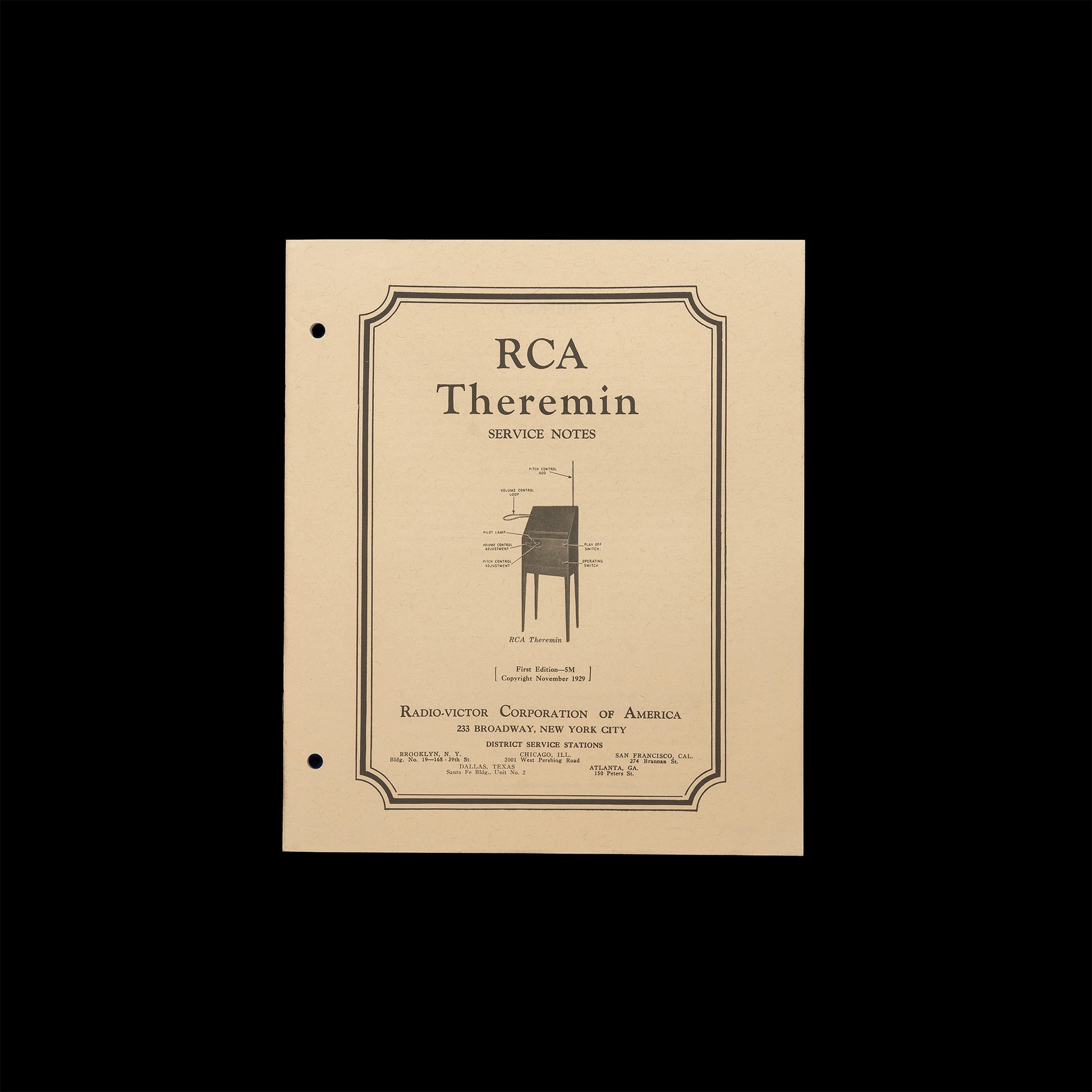 RCA’s Service Department originally printed these service notes as a stand-alone document. It was subsequently reprinted as part of the RCA Victor 1929–1930 Service Notes, available to authorized field service radio technicians. Originally meant to acquaint them with the theremin’s unconventional circuitry and to facilitate repairs, it is safe to say that very few of the RCA Service Notes’ original readers ever actually encountered a theremin. Original copies of the higher quality standalone RCA Theremin Service Notes are now exceedingly rare.