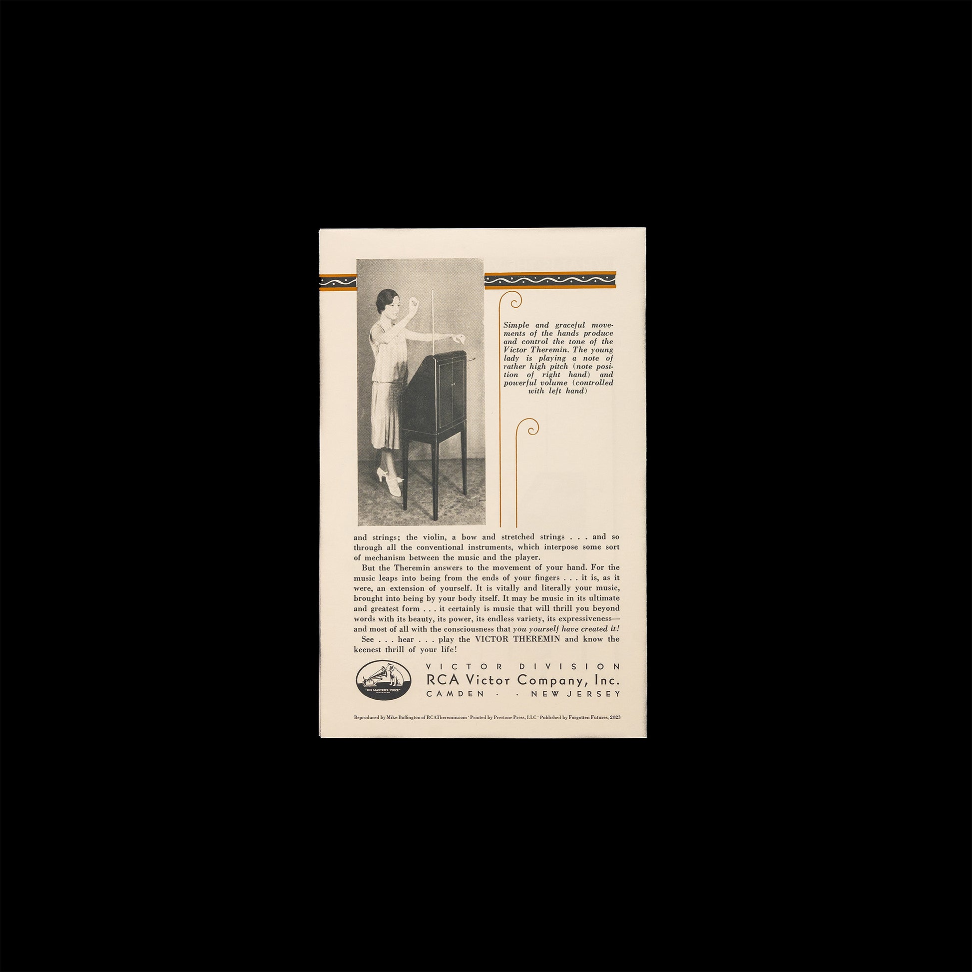 The original 1930 version of this sales brochure is mostly identical to the earlier RCA Theremin brochure in content, although changes in imagery and text reflect the move of the RCA Theremin to the newly acquired Victor division of the company. Original copies of this brochure are now exceedingly rare.